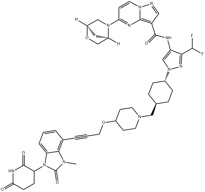 KT-474 (KYM-001; PROTAC IRAK4 degrader 7) is an orally active PROTAC IRAK4 degrader with anti-tumor effects. KT-474 is a click chemistry reagent that contains alkyne groups and can undergo copper catalyzed azide alkyne cycloaddition (CuAAc) with molecules containing azide groups.